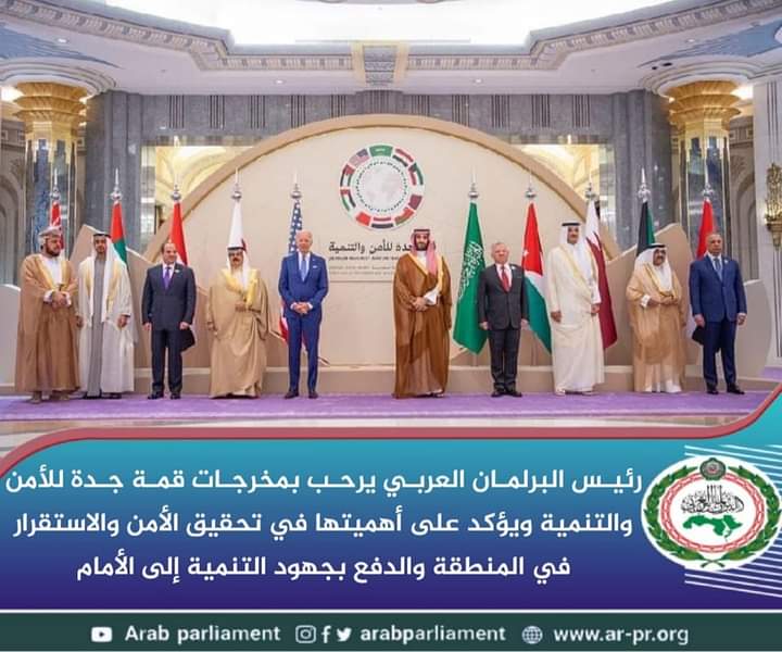 رئيس البرلمان العربي يرحب بمخرجات قمة جدة للأمن والتنمية ويؤكد على أهميتها في تحقيق الأمن والاستقرار في المنطقة والدفع بجهود التنمية إلى الأمام