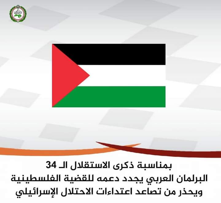 بمناسبة ذكرى الاستقلال الـ 34 البرلمان العربي يجدد دعمه للقضية الفلسطينية ويحذر من تصاعد اعتداءات الاحتلال الإسرائيلي