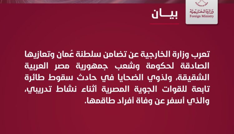 وزارة الخارجية العمانية تعلن تضامن سلطنة عُمان وتعازيها الصادقة لحكومة وشعب جمهورية مصر العربية الشقيقة، ولذوي الضحايا في حادث سقوط طائرة تابعة للقوات الجوية المصرية أثناء نشاط تدريبي