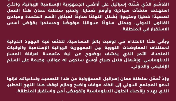 وإذ تحمل سلطنة عمان إسرائيل المسؤولية عن هذا التصعيد وتداعياته، فإنها تدعو المجتمع الدولي إلى اتخاذ موقف واضح وحازم لوقف هذا النهج الخطير الذي يهدد بإقصاء الحلول الدبلوماسية وتقويض أمن واستقرار المنطقة.
