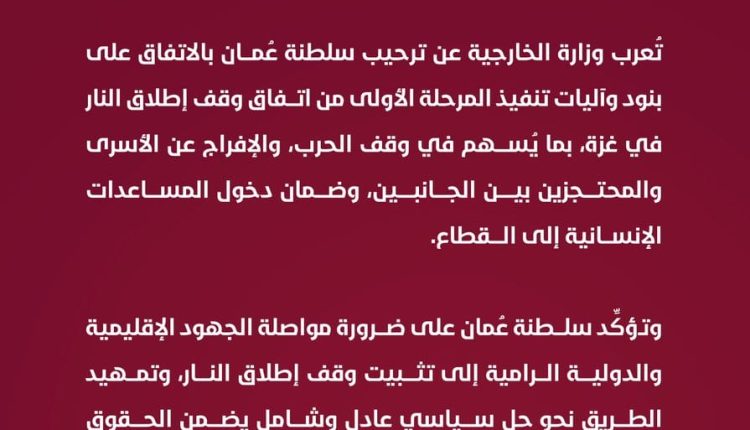 سلطنة عُمان ترحب بالاتفاق على بنود وآليات تنفيذ المرحلة الأولى من اتفاق وقف إطلاق النار في غزة، بما يُسهم في وقف الحرب، والإفراج عن الأسرى والمحتجزين بين الجانبين