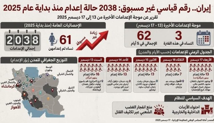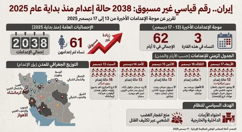 وفقاً للتقارير التي وردت حتى بعد ظهر يوم الأربعاء 17 ديسمبر/كانون الأول، تم إعدام 62 سجيناً، بينهم 3 نساء، في الفترة من 13 إلى 17 ديسمبر/كانون الأول. عدد الإعدامات، خاصة في يوم 17 ديسمبر/كانون الأول، أكبر بكثير وسيتم الإعلان عنه بعد التدقيق. وبذلك، وبينما بقي أسبوعان فقط على نهاية عام 2025، وصل عدد الإعدامات المسجلة في هذا العام إلى رقم غير مسبوق بلغ 2038 شخصاً، وتشكل السجينات 61 من الضحايا.